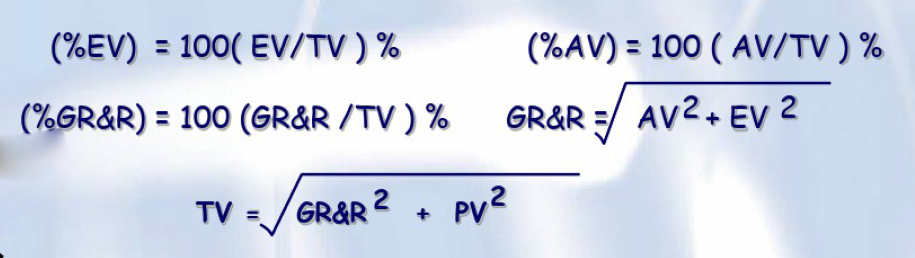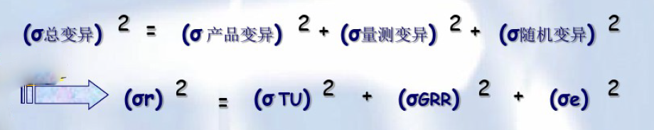 我(wo)們(men)知道(dao)同一產品在溫度(du)(du)/濕度(du)(du)等(deng)等(deng)環境下本身特性上會發生一些變異,量測的儀(yi)器(qi)/工具也會發生變異,還有其他(ta)的一些隨(sui)機的變異;而(er)這(zhe)些變異就(jiu)會產生數據上的誤(wu)(wu)差;那么我(wo)們(men)可以理解:看到(dao)的數據誤(wu)(wu)差(σr)可包含(han)產品誤(wu)(wu)差(σTU)、儀(yi)器(qi)量測誤(wu)(wu)差(σ GRR)、其他(ta)隨(sui)機誤(wu)(wu)差(σe)三個部分。