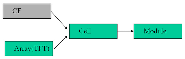 TFT 顯示器的生產可以分成四個工序段:CF、TFT、Cell、Module。其相互關系見下圖: