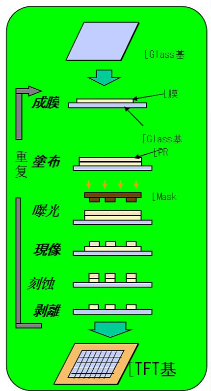 在上面的(de)(de)工藝(yi)(yi)流程中(zhong),我們提(ti)到,陣(zhen)列(lie)的(de)(de)工藝(yi)(yi)流程是(shi)成膜、光刻、刻蝕(shi)等工藝(yi)(yi)制程的(de)(de)反復使用(yong)。以下就這些工藝(yi)(yi)制程作具(ju)體的(de)(de)介(jie)紹。