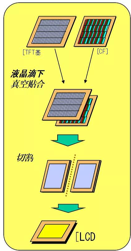 Cell 工序是從將TFT 基板和 CF 基板作定向處理后對貼成盒,到切割成單粒后貼上片光片。具體見下圖: