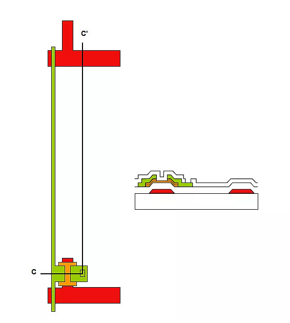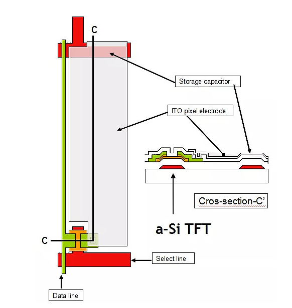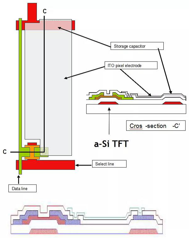 采用背溝道刻蝕型(BCE)TFT 顯示像素的結構。具體結構見下圖:
