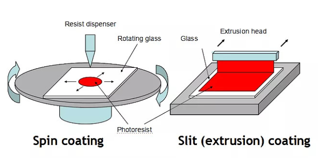 在玻璃表面涂布一層光刻膠的過程叫涂膠。對于小的玻璃基板,一般使用旋轉涂布的方式。但對大的基板,一般使用狹縫涂布的方式。見以下示意圖: