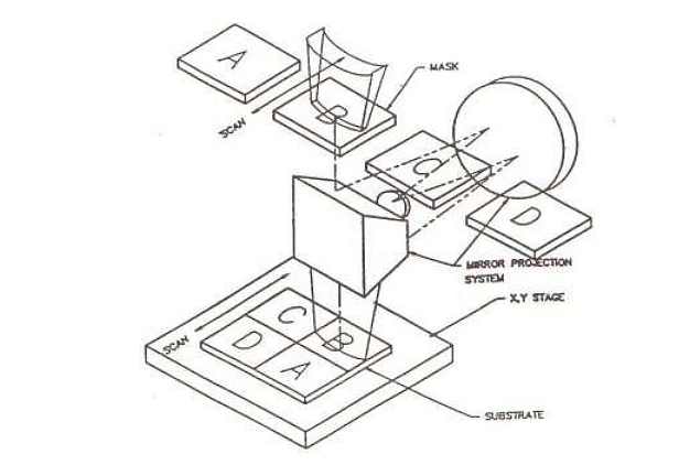 涂膠后的玻璃基板經干燥、前烘后可以作圖形曝光。對于小面積的基 板,可以采用接近式一次完成曝光。但對大面積的基板,只能采用多次投影曝光的方式。下圖是Canon 曝光機的工作原理圖: