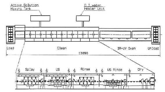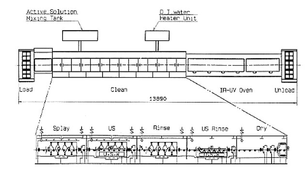 具體在工藝流程中,玻璃基板流入生產線前有預清洗;每次成膜前有成膜前清洗;每次光阻涂布前有清洗;每次濕刻后及脫膜后也有清洗。一般清洗設備的結構如下: