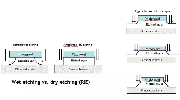 干刻是利用等離子體作為刻蝕氣體,等離子體與暴露在外的膜層進行反應而將其刻蝕掉。等離子體刻蝕有各向異性的特點,容易控制刻蝕后形成的截面形態;但但高能等離子體對膜的轟擊會造成傷害。濕刻與干刻的原理見下 圖: