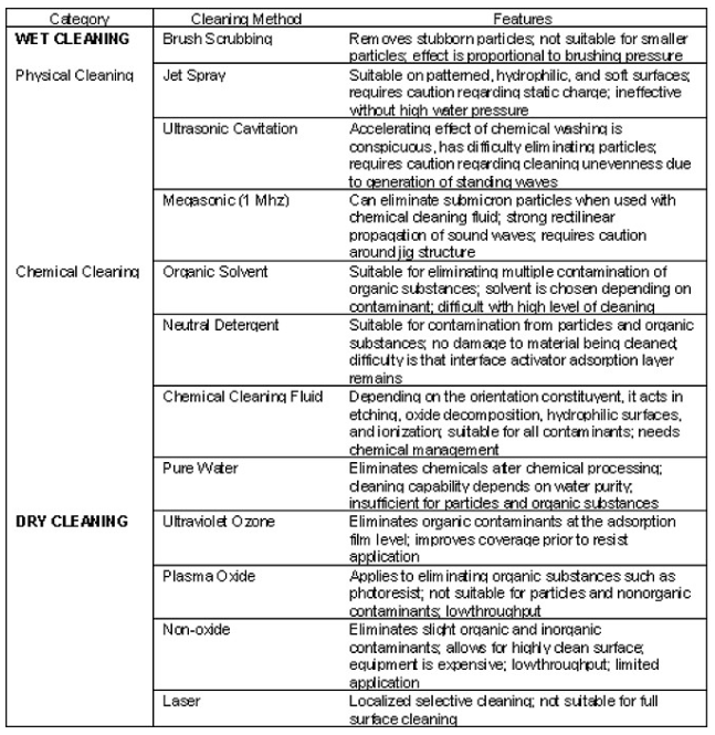 清洗,顧名思義就是將玻璃基板清洗干凈。這是整個LCD工藝流程中使用最頻繁的工藝制程。在每次成膜前及濕制程后都有清洗。清洗有濕洗和干洗,有物理清洗和化學清洗。其作用和用途詳見下表: