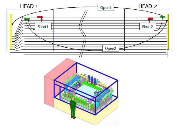 開路/短路電測的原理很簡單:將兩個探針放在電極的兩端,檢測電流以判斷電極是否開路;將兩個探針放在相鄰的兩個電極上,檢測電流以判斷這兩個電極間是否短路。下圖是原理的示意圖和相關設備圖: