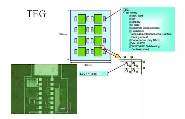 在陣列制作的工藝過程中,有許多中間環節的電氣性能直接影響到產品的最終性能,必須加以檢測。如層間的接觸電阻,電極間的電容等。為了檢測這些中間環節的電氣性能,會在正常顯示屏電氣線路以外的區域,專門設計一些檢測中間性格的電氣單元(Test Element Group),并通過專門的TEG 檢測設備作測試(shi)。常見(jian)的(de)TEG 電(dian)氣單元有(you): 引線電(dian)阻(zu)、TFT、存儲電(dian)容、接觸(chu)電(dian)阻(zu)、跨越臺階(jie)的(de)引線電(dian)阻(zu)等。TEG 的(de)位置及設計范例(li)如下(xia)圖:
