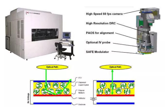 陣列電測大致分為電荷檢測、電子束檢測和光學檢測三種檢測方法。這三種檢測方法各有優劣。目前天馬采用光學的檢測方法。其原理和相關設備見下圖: