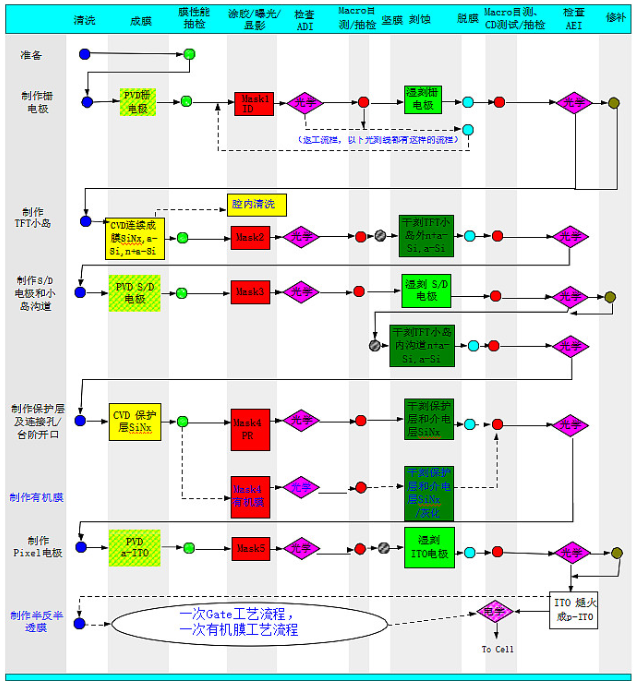 在主要工藝流程和制程的基礎上,加入輔助工藝制程和返工流程,一個陣列段完整的工藝流程如下圖: