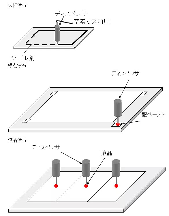 邊框料的作用有三:一是將CF 與TFT 基板粘結在一起;二是將盒厚固定下來;三是將液晶限制在盒內。銀點料的作用是導通 CF 和TFT 上的Common 電極。對ODF 工藝而言,邊框料和銀點料必須是采用快速固化的 UV 固化膠。液晶(Liquid Crystal)的作用是改變盒的光學狀態。這三種材料的涂布都是采用一種叫Dispensor 的涂布頭來完成的。其示意圖分別如下: