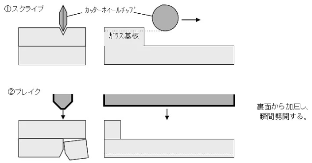 在產品盒制作完成后,需要將這些排列在一起的盒分割成獨立的屏。這個過程就稱為切割。切割是通過金剛刀輪在玻璃表面滑過來完成的。其原理圖如下: