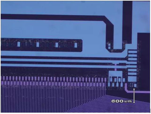 COG(Chip on Glass)和 FPC (Flexible Printed Circuit)是一種電路的連接方式。由于電極多,一對一的排線連接很困難。現在通常的做法是將玻璃上的引線作成陣列,IC/FPC上的引線也作成對應陣列,通過一種各向異性導電膜(ACF)將IC/FPC上的電極與玻璃上的電極一對一連接導通。玻璃上的引線電極陣列示意圖如下: