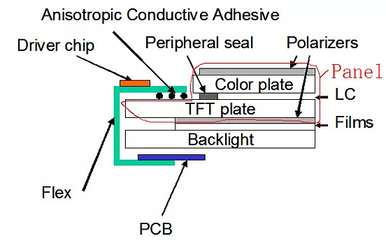 邦定后IC/FPC、屏、及 ACF 的相對位置如下圖: