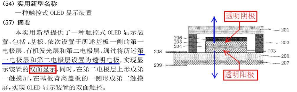 雙透型雙面OLED顯示裝置,單發光模組,模組厚度小,但是F-P諧振腔效應較差,出光效率低,其實通過將陽極和陰極同時設置為透明結構,進而在相對的兩個表面獲得出射光束,實現雙面顯示,具體的解決方案可參見專利CN203630761U: