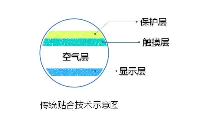 傳(chuan)統貼(tie)合(he)工藝,就是把保護玻璃和觸摸層(ceng)完全貼(tie)合(he),再與顯示層(ceng)進行邊框(kuang)貼(tie)合(he),中間會有空(kong)氣層(ceng)。