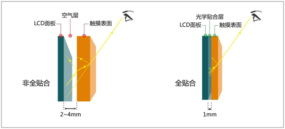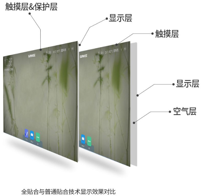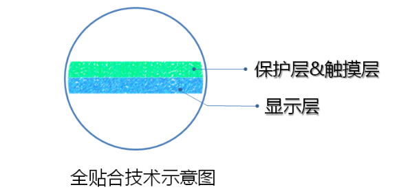 全貼合工藝,就是把觸摸層做到保護層上,再和顯示層完全貼在一起,沒有中間空氣層。