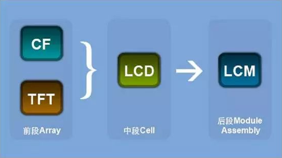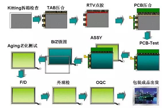 如(ru)上圖,后段Module制程主(zhu)要(yao)是液晶(jing)基板的(de)驅(qu)動(dong)(dong)IC壓合(he)與印(yin)刷電(dian)路板的(de)整(zheng)合(he),這一部(bu)分(fen)可(ke)以將(jiang)從主(zhu)控(kong)電(dian)路接受到(dao)的(de)顯示信號(hao)傳輸到(dao)驅(qu)動(dong)(dong)IC上,驅(qu)動(dong)(dong)液晶(jing)分(fen)子轉(zhuan)動(dong)(dong),顯示圖像。此外,背光部(bu)分(fen)在(zai)此環(huan)節會與液晶(jing)基板整(zheng)合(he),完整(zheng)的(de)液晶(jing)面(mian)板就完成了。