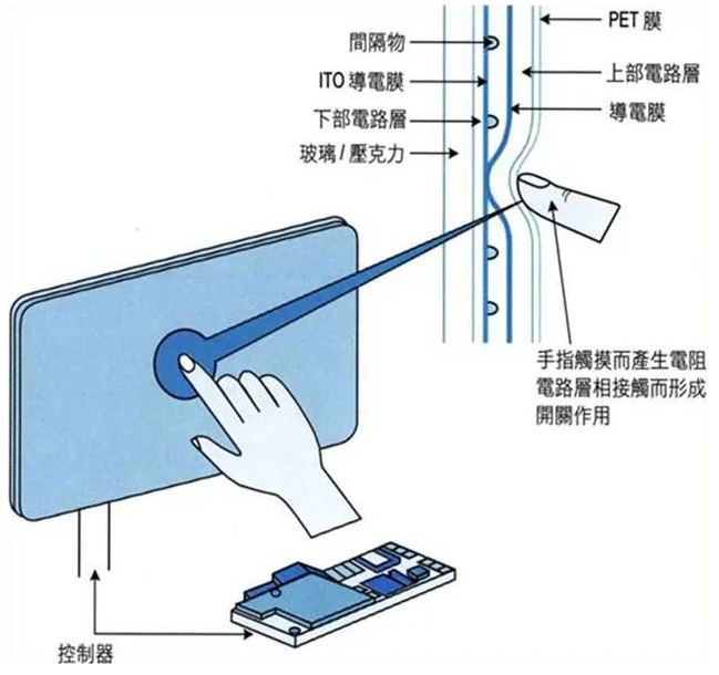 電阻觸摸屏的主要部分是一塊與顯示器表面非常配合的電阻薄膜屏,這是一種多層的復合薄膜,它以一層玻璃或硬塑料平板作為基層,表面涂有一層透明氧化金屬 (ITO氧化銦,透明的導電電阻) 導電層,上面在蓋有一層外表面硬化處理、光滑防擦的塑料層 、它的內表面也涂有一層ITO涂層 、在他們之間有許多細小的(小于1/1000英寸)的透明隔離點把兩層導電層隔開絕緣 。當手指觸摸屏幕時,兩層導電層在觸摸點位置就有了接觸,控制器偵測到這一接觸并計算出(X,Y )的位置,再根據模擬鼠標的方式運作。
