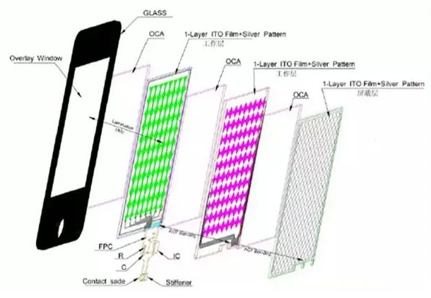 工作原理:觸摸屏采用多層ITO層,形成矩陣式分布,以X軸、Y軸交叉分布做為電容矩陣,當手指觸碰屏幕時,可通過X、Y軸的掃描,檢測到觸碰位置電容的變化,進而計算出手指之所在。基于此種架構,投射電容可以做到多點觸控操作。