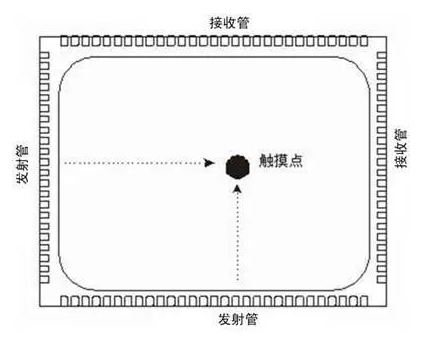 工作原理:紅外觸摸屏是利用X、Y方向上密布的紅外線矩陣來檢測并定位用戶的觸摸。如圖4所示,紅外觸摸屏在顯示器的前面安裝一個電路板外框,電路板在屏幕四邊排布紅外發射管和紅外接收管,一一對應形成橫豎交叉的紅外線矩陣。用戶在觸摸屏幕時,手指就會擋住經過該位置的橫豎兩條紅外線,因而可以判斷出觸摸點在屏幕的位置。任何觸摸物體都可改變觸點上的紅外線而實現觸摸屏操作。