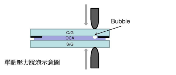 一次(ci)脫泡(pao)(pao)(pao)后留下(xia)的小氣泡(pao)(pao)(pao)很難再次(ci)脫掉,因(yin)為氣泡(pao)(pao)(pao)縮小了(le)(le)而相對面積(ji)下(xia)的OCA變大了(le)(le),行成圍墻效應,也(ye)就是說壓力(li)無法(fa)有效傳遞到小面積(ji)的氣泡(pao)(pao)(pao)上,導致無法(fa)脫泡(pao)(pao)(pao)完成,可以使用單點(dian)壓力(li)脫泡(pao)(pao)(pao)的來解(jie)決這(zhe)個問題(ti)