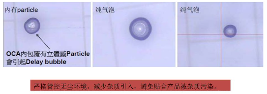 這種類型的Delay Bubble 是最麻煩的類型,這類型的再發氣泡是由OCA及OCA與TP/LCM夾層的Particle(雜質)引起的,但不是所有的Particle 都會產生這種類型再發氣泡,也與Particle 的尺寸大小無關,無法根據單純的量測篩選作防治,主要的關鍵點在于Particle 的立體形狀,一般立體的Particle 容易產生氣泡。