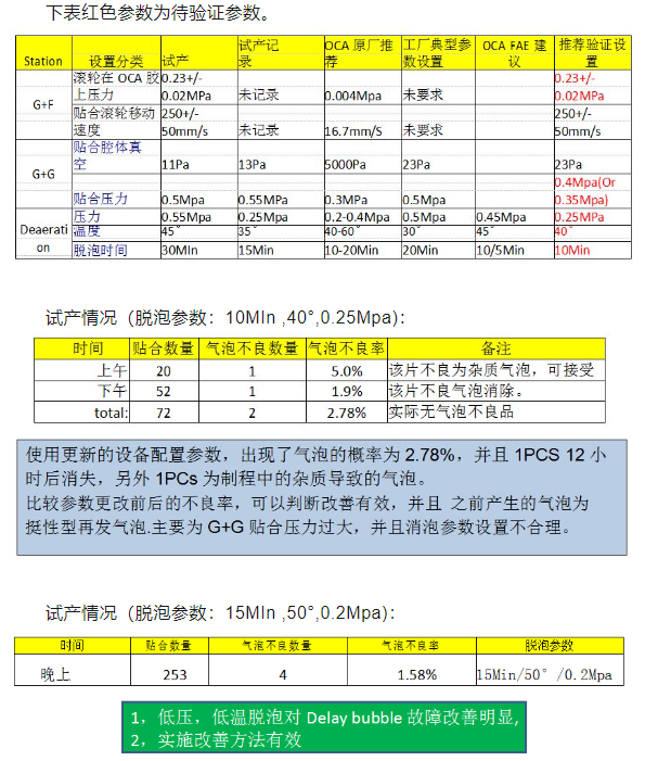 匯總收集到的生產工藝設置參數,根據脫泡失效原理中各參數的影響,針對滾輪壓力,貼合壓力,脫泡壓力,脫泡溫度,脫泡時間重新設置參數,考慮到目前的氣泡反彈現象,將與產品變形相關的參數調整到最小。