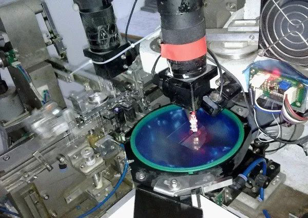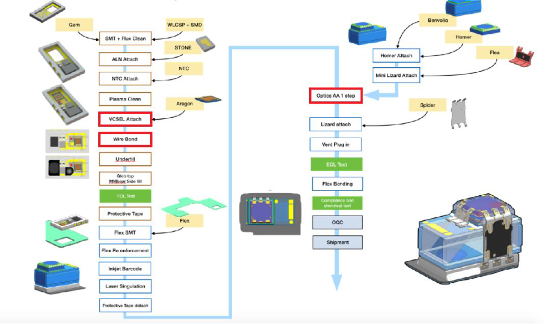 上圖是(shi)蘋果(guo)激光發(fa)射器模組的(de)組裝工(gong)藝流程(cheng)圖,其中紅色標注的(de)三(san)道(dao)工(gong)藝是(shi)整(zheng)個組裝加工(gong)的(de)關鍵,分別是(shi)Die bond(固晶(jing))、Wire Bond(打線)和AA(自動對準(zhun))。這篇我(wo)們先來談談Die Bond。