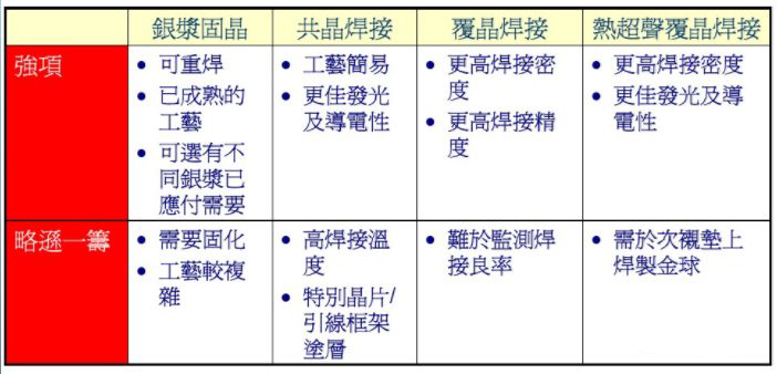 就我個人了解,目前固晶有銀漿固晶、共晶焊接、覆晶焊接和熱超聲覆晶焊接四種類型。如下列出了各自的加工示意圖。