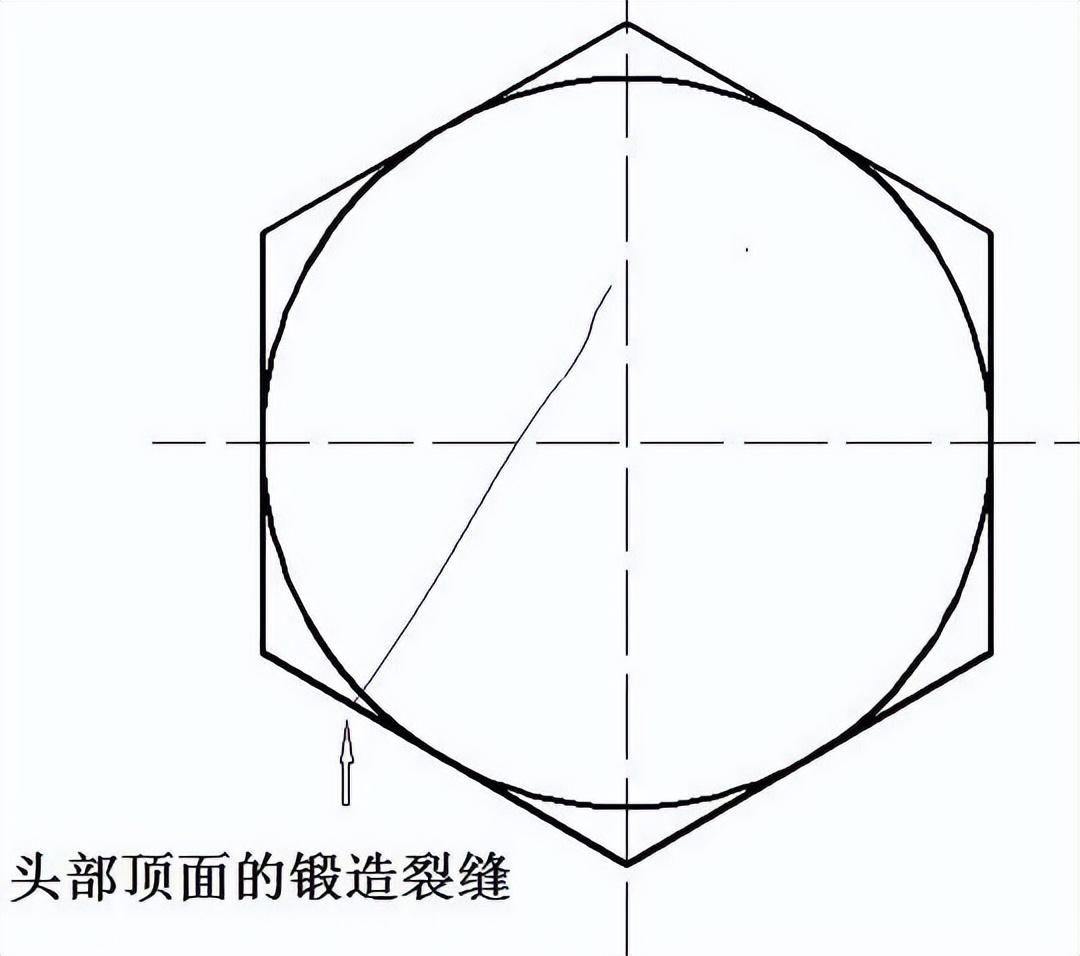 產(chan)生原因(yin):鍛造裂縫可能在切料或鍛造工序中產(chan)生,并位于螺栓和螺釘的頭部頂面,以及凹穴頭部隆起部分。