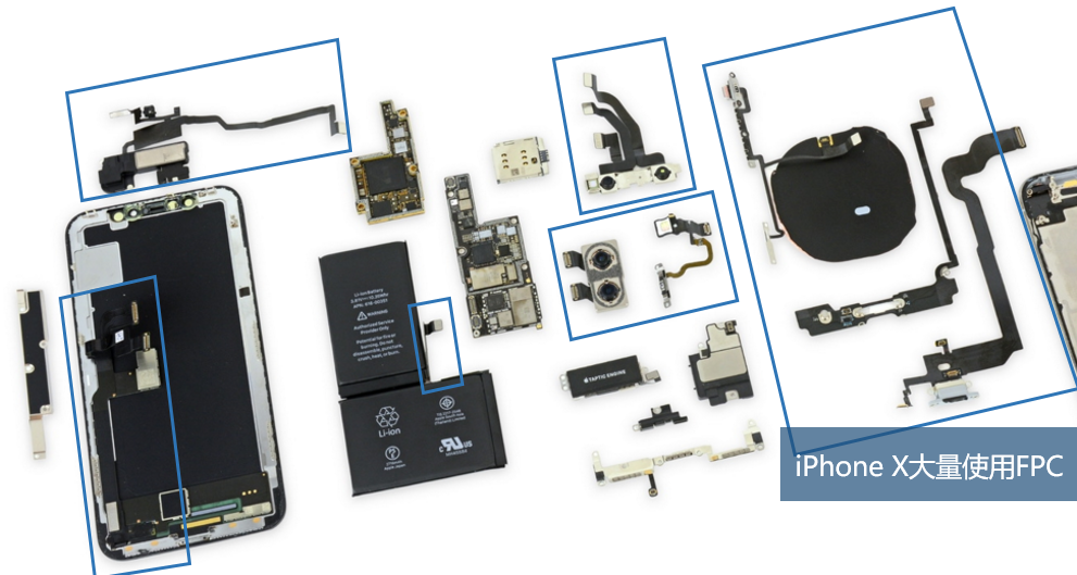 如(ru)下圖,在iPhone X里,大量(liang)使用FPC。LCD、原深感攝(she)像頭、雙(shuang)攝(she)像頭、側(ce)按鍵(jian)、USB口、電(dian)池,通通都是(shi)(shi)使用FPC連接到(dao)主板(ban)的。(其他手(shou)機也是(shi)(shi)這樣的,寸土寸金)。