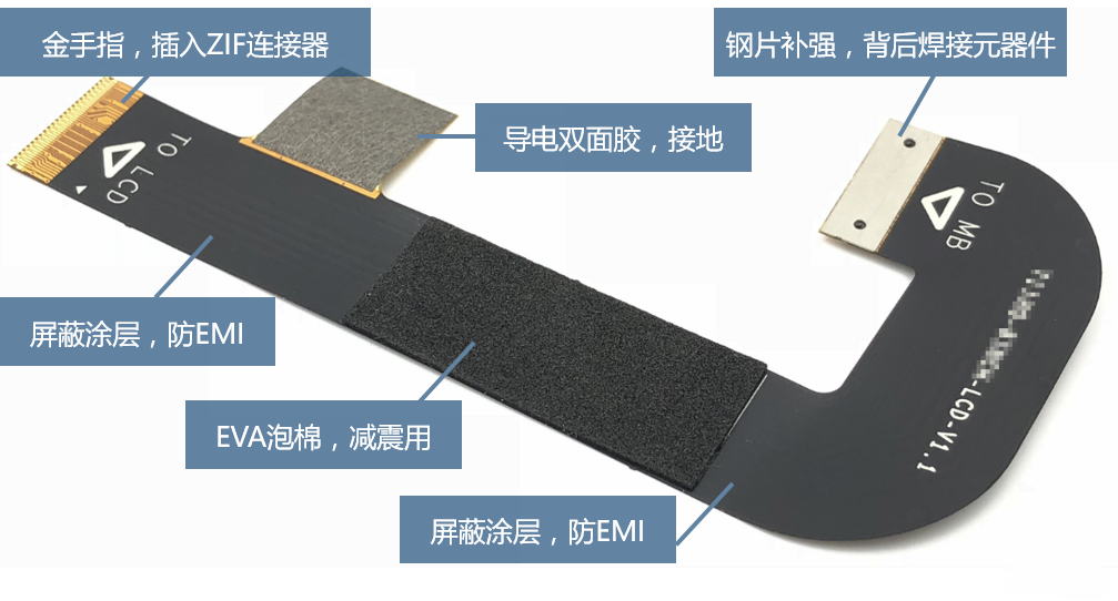 FPC連接器也無法做到0.15那么薄,一般都是0.2-0.3mm,因此也需要補強片把FPC金手指部分加厚一些,適配ZIF連接器。
