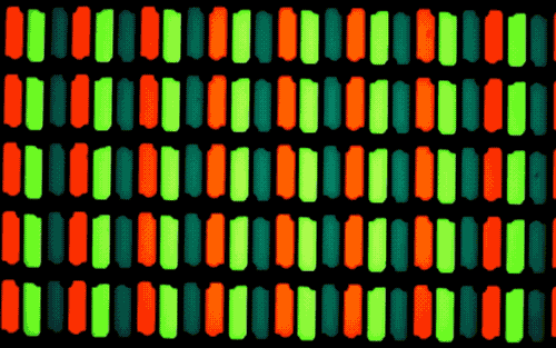 因為 CF 彩色濾光片上印刷有 RGB 三種顏色的色塊,那等到屏幕背光源的光線穿過時,來~我們對照上圖看個順序:光線先是穿過透明的 TFT 薄膜晶體管基板,再透過液晶分子,然后再透過 CF 彩色濾光片,受各個色塊下液晶分子的穿透率不同的影響,色塊就會發出下圖這樣亮暗不同的紅綠藍三色,從而混合成顯示所需要的顏色。