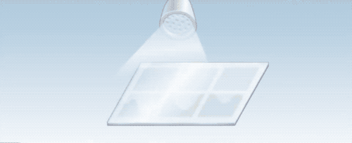 接著噴灑間隔物,目的是控制液晶層厚度與支撐兩片基板中間的空間。