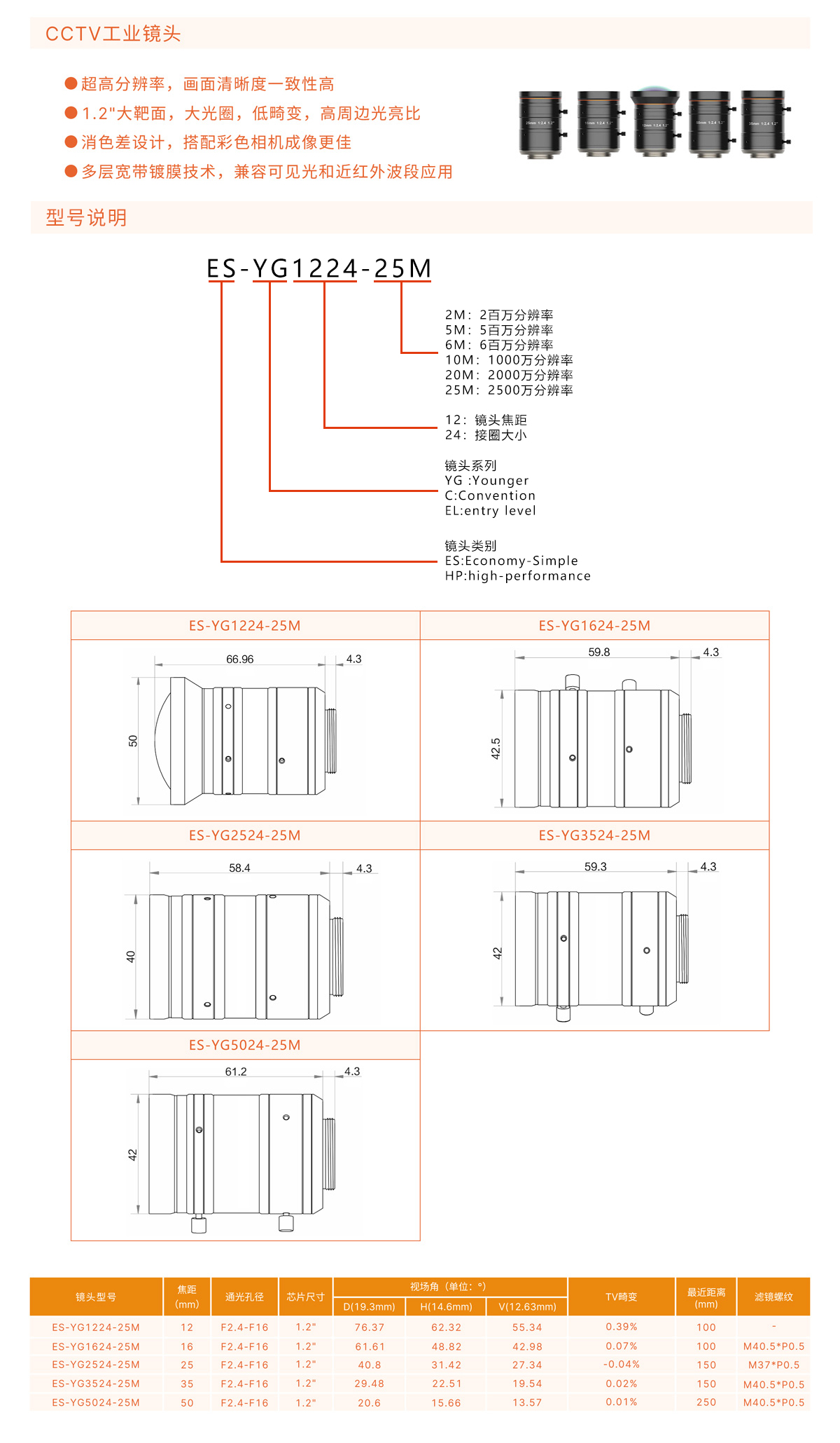 1.2"大靶面,大光圈,低畸變,高周邊光亮比