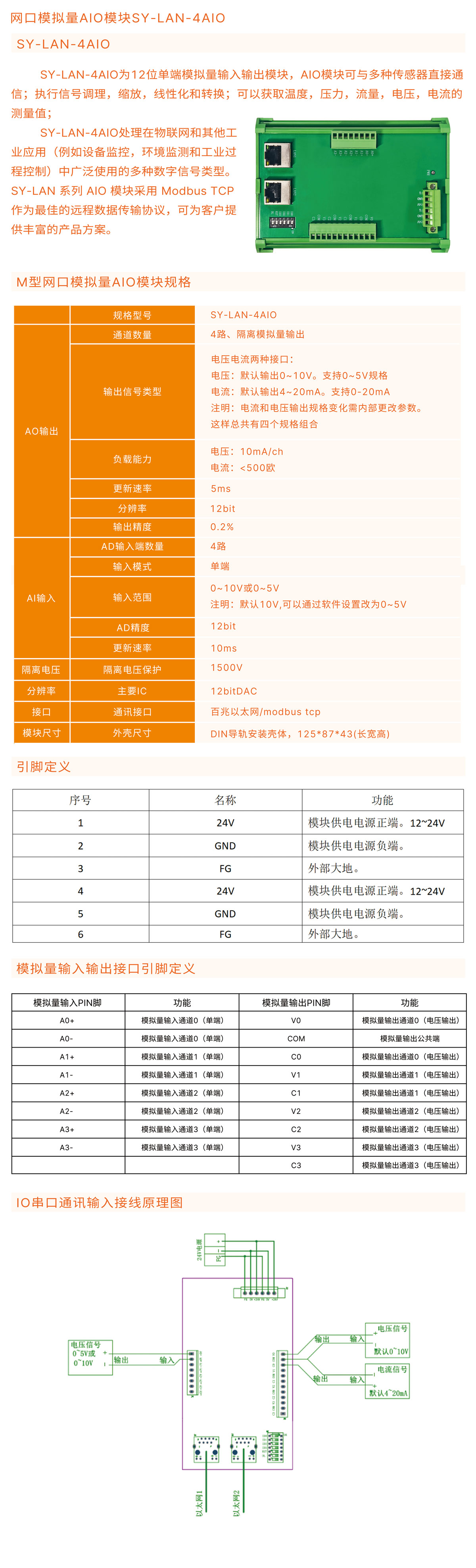 SY-LAN系列AIO模塊是以太網接口模擬量AIO模塊,4通道模擬量輸出/4通道模擬輸入支持 Modbus TCP 的遠程 I/O 模塊,并提供高達1500VRMS高電壓隔離保護