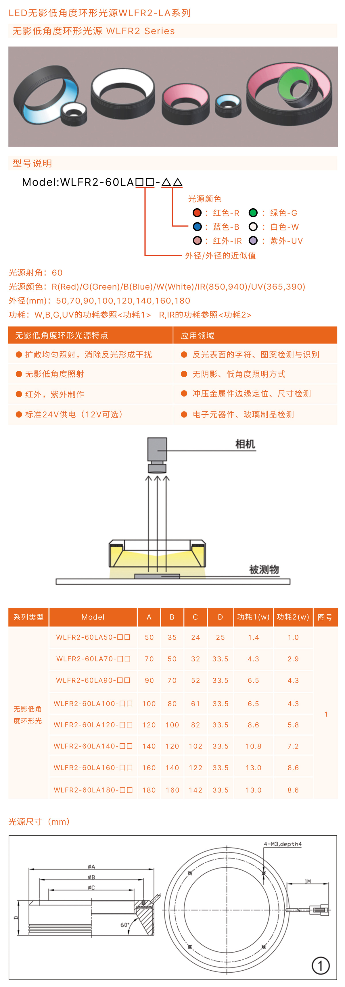 擴散均勻照射,消除反光形成干擾,無影低角度照射,紅外,紫外制作,標準24V供電(12V可選)