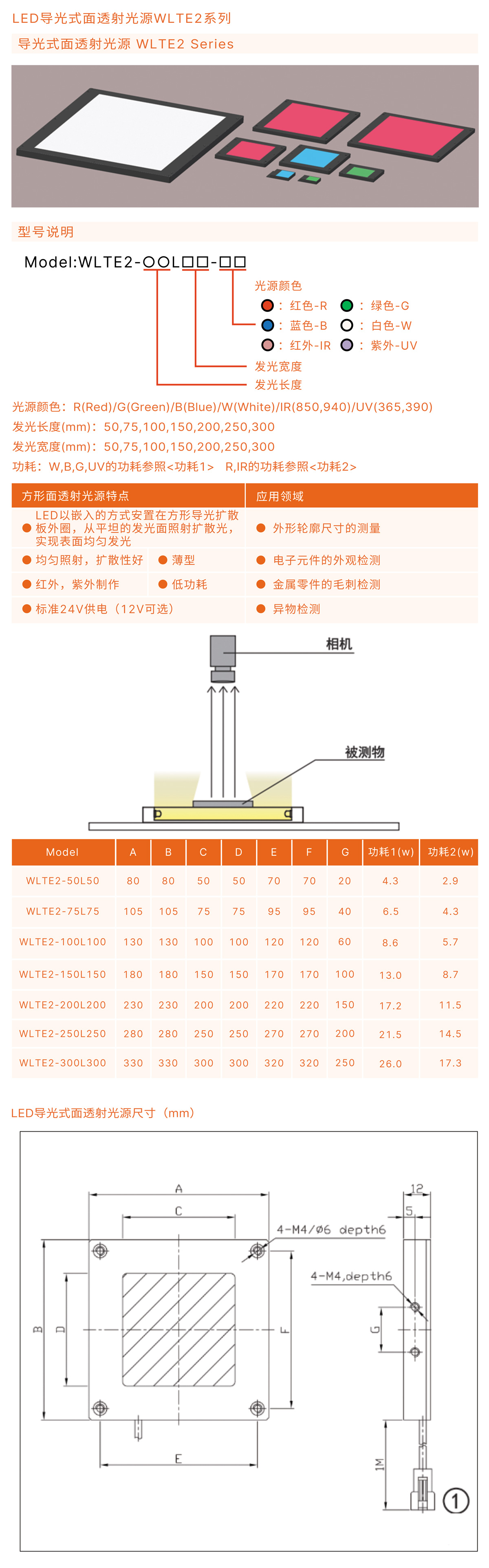LED以嵌入的方式安置在方形導光擴散板外圈,從平坦的發光面照射擴散光,實現表面均勻發光。均勻照射,擴散性好。薄型低功耗導光式面透射光源,有紅外,紫外可選。