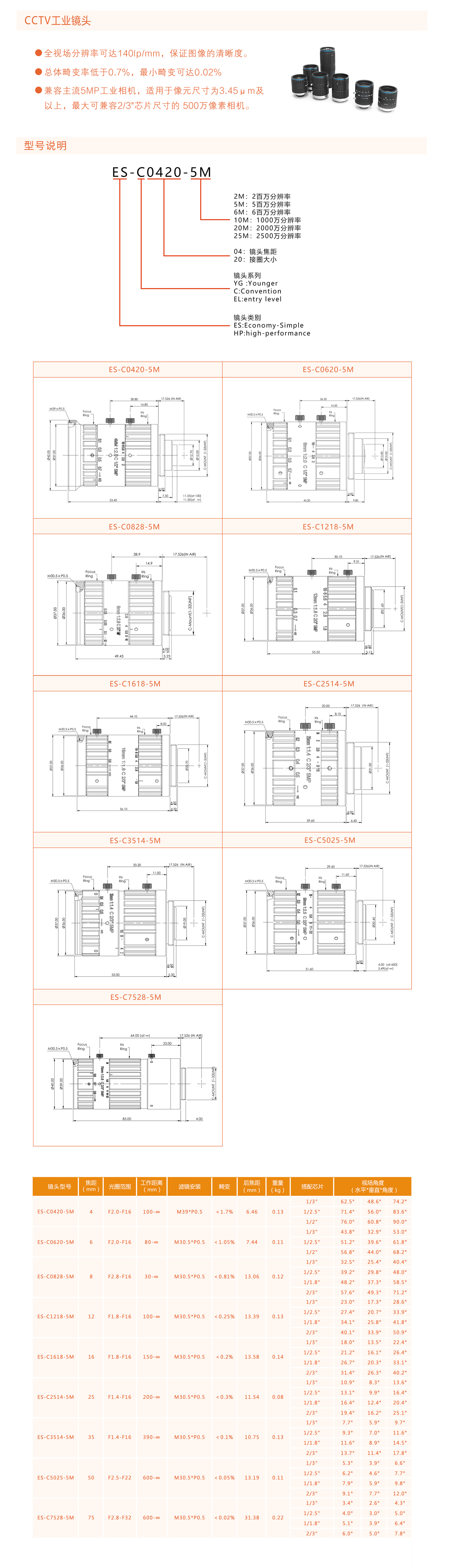 ●兼容主流5MP工業相機,適用于像元尺寸為3.45um及以上,最大可兼容2/3”芯片尺寸的500萬像素相機。
