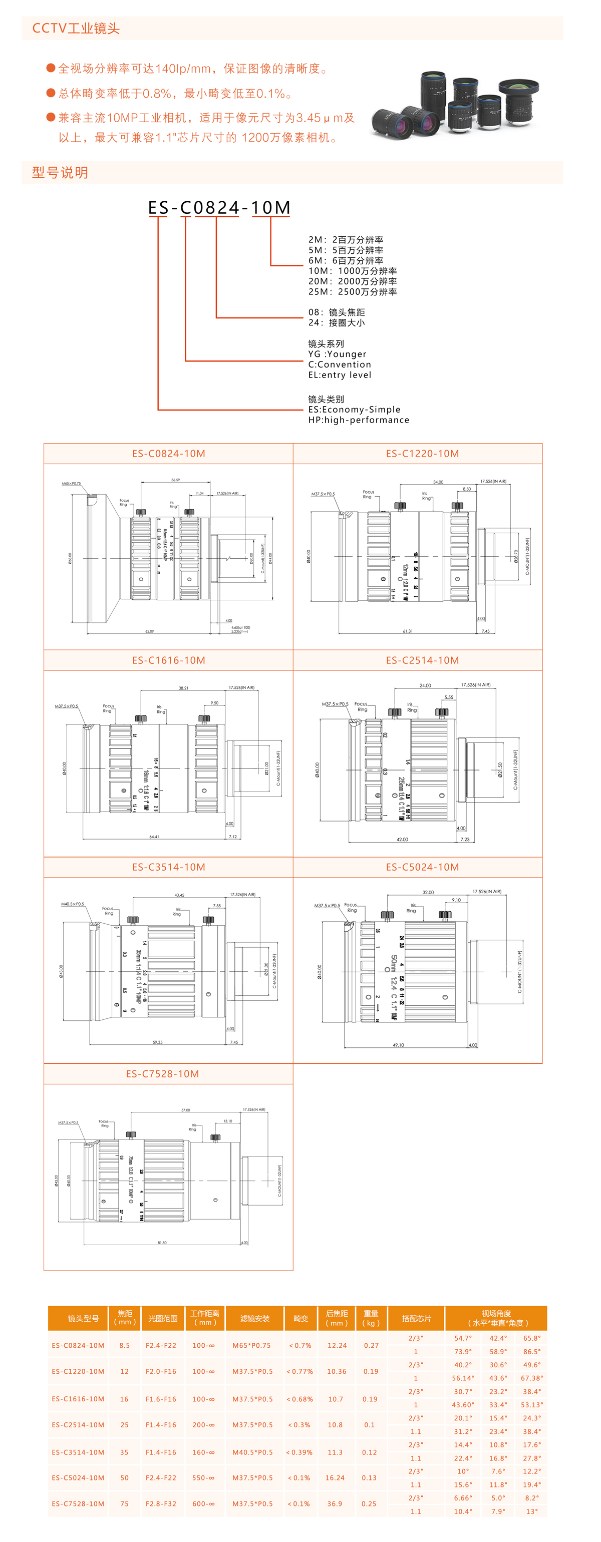 ●兼容主流10MP工業相機,適用于像元尺寸為3.45um及以上,最大可兼容1.1"芯片尺寸的1200萬像素相機。